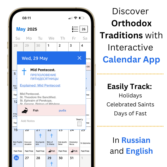 Track all Fasting Days, Orthodox holidays, and learn more about our Russian Orthodox Traditions. Created by the community, for the Community. Learn More About the APP and Download it here!